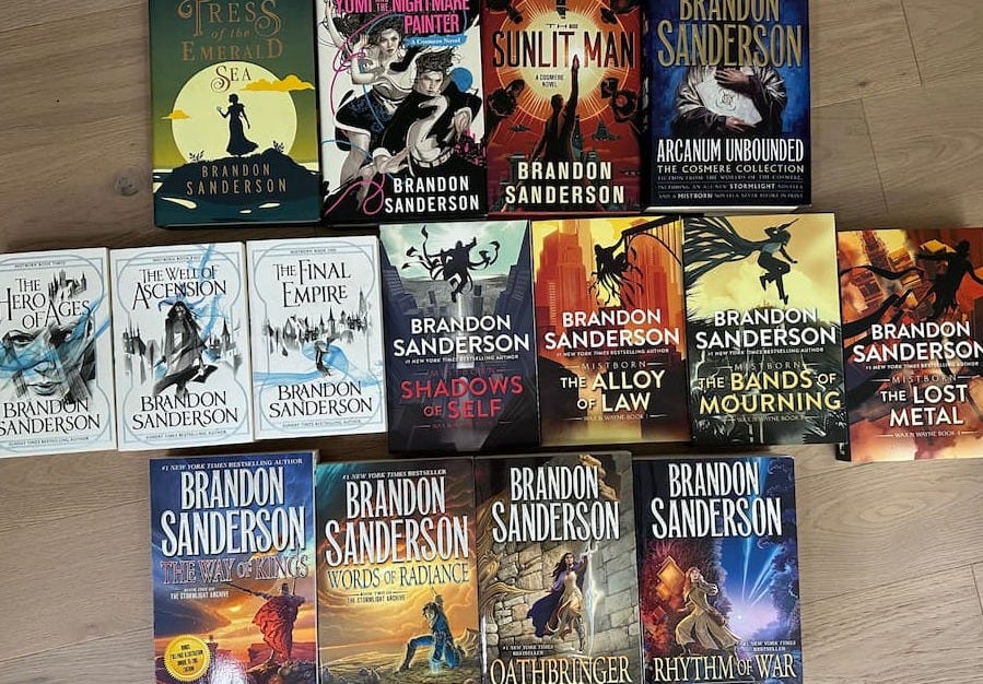 If you’ve been reading my Substack for any length of time, you’ll have noticed that I’m a huge admirer of Brandon Sanderson. He writes some of the best and most imaginative fantasy out there, and he’s an absolute master of world-building. And he’s also quite ridiculously prolific. He doesn’t just write a lot of books - 39 novels so far, and around 30 novellas, short story collections and graphic novels - he writes long books. A thousand pages is normal for him. The five volumes of The Stormlight Archive books are all 1300 pages, and the type gets smaller in each volume.